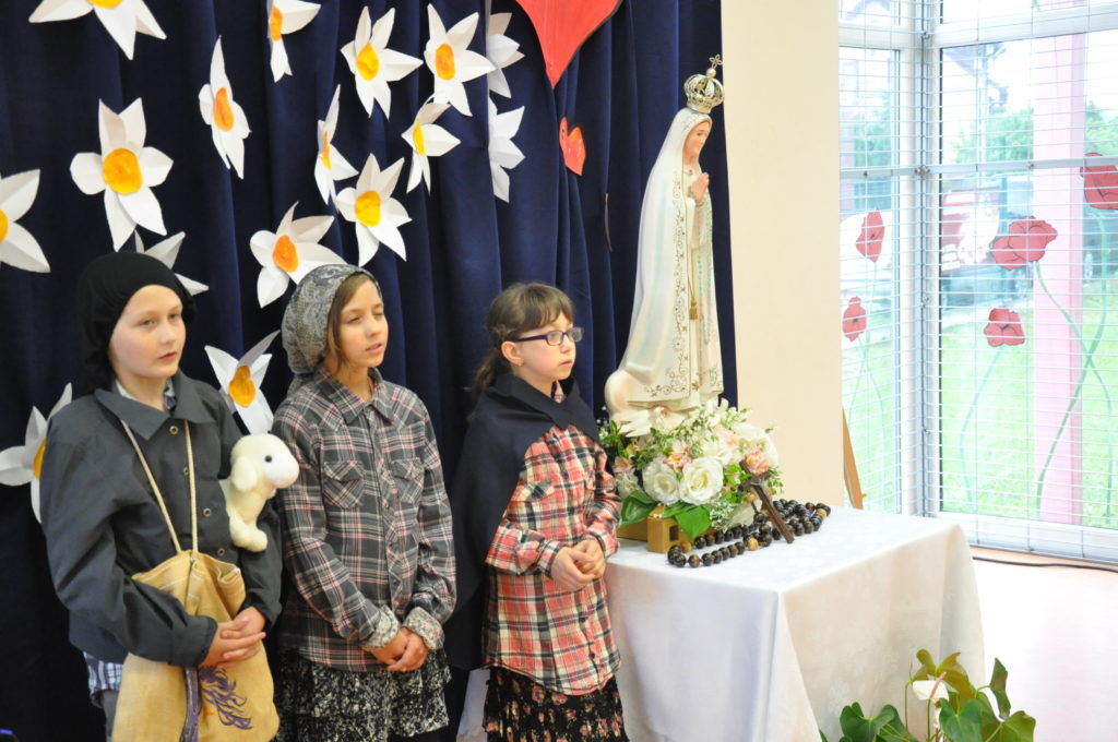 W czwartek w naszej szkole i w Popowicach obchodziliśmy uroczyście Dzień Mamy i Taty. Z tej okazji zebraliśmy się w Kaplicy pw. św. Maksymiliana w Popowicach i wyruszyliśmy z figurką Matki Bożej Fatimskiej do szkoły, którą niosły Panie ze Stowarzyszenia Kobiet Popowickich. Towarzyszyły nam również fatimskie dzieci: Hiacynta, Łucja i Franciszek. W drodze modliliśmy się za naszych Rodziców. Po dotarciu do szkoły zaśpiewaliśmy majówkę ku czci Matki Bożej, a następnie dzieci dla Mam i Tatusiów oraz wszystkich zebranych gości zaprezentowały wzruszającą akademię. Z oczu niejednej Mamy popłynęły łzy.