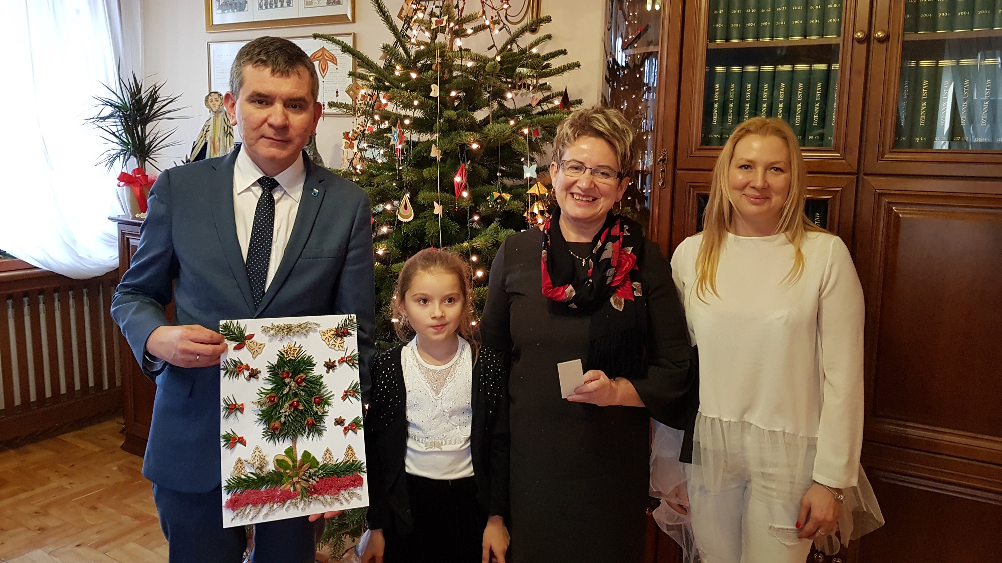 Pan Burmistrz bardzo podziękował za piękną kartkę, którą wykonała Pani Aneta Lompart wraz z uczniami pierwszej klasy, do której dołączony był śpiew kolędy w wykonaniu Leny i prosił, aby wszystkich przekazać życzenia Błogosławieństwa Bożego i wsparcia św. Kingi w realizacji zadań i codziennych obowiązków.