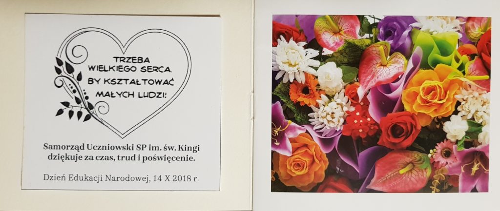 W tym samym dniu odbył się Dzień Edukacji Narodowej, który przygotowała Pani Dorota Kruczek wraz z uczniami klasy czwartek. W czasie akademii Pani Dyrektor złożyła wszystkim nauczycielom i pracownikom szkoły, a niektórym szczególne wyróżnienia w postaci Nagrody Dyrektora. Do tych życzeń dołączyła się Rada Rodziców, która w osobie Przewodniczącej Pani Justyny Sejud, wyraziła wdzięczność nauczycielom i pracownikom szkoły za trud i poświęcenie oraz Samorząd Uczniowski, który dla wszystkich przygotował okolicznościowe „perełki” z życzeniami.