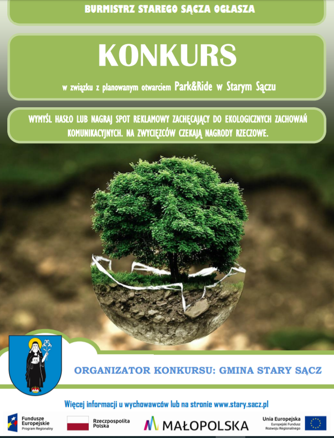 Serdecznie zapraszam do wzięcia udziału w konkursie organizowanym przez Gminę Stary Sącz z okazji planowanego otwarcia Park&Ride. Każdy, kto wymyśli hasło lub nagra spot reklamowy zachęcający do ekologicznych zachowań komunikacyjnych może wygrać nagrody rzeczowe. Uczniowie mogą wymyślić jedno hasło (indywidualnie) lub spot reklamowy (indywidualnie lub w grupie 2-5 osób) i złożyć swoją pracę do 13 listopada br. u Pani Moniki Wojtaszek, która również służy pomocą i ciekawymi pomysłami. Pani Monika ma również potrzebne karty zgłoszeń oraz zgody i udzieli wszelkich informacji.