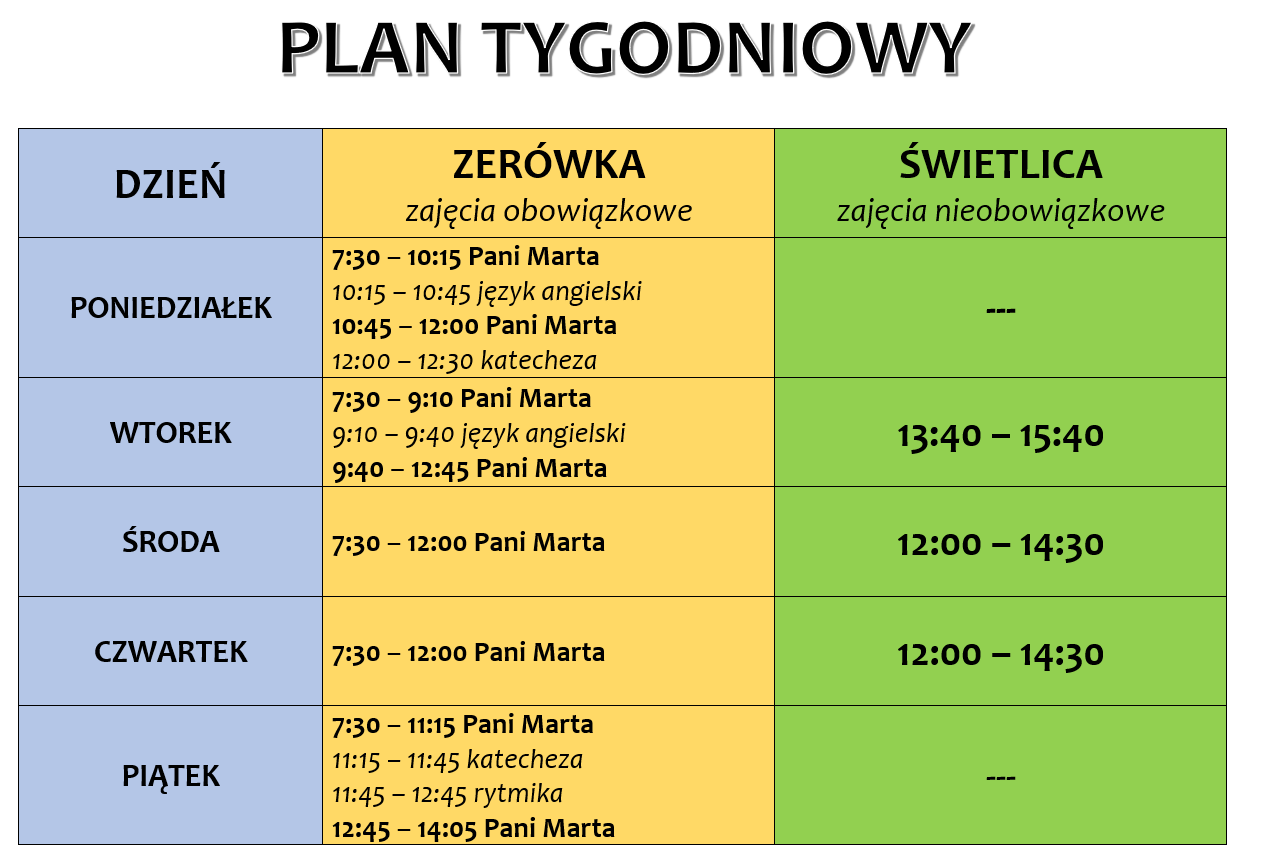 Od środy 8 stycznia br. zmienił się plan lekcji przedszkola-zerówki. Zmiana dotyczy poniedziałku – dzieci kończą 15 minut wcześniej i piątku – dzieci kończą 10 minut wcześniej.