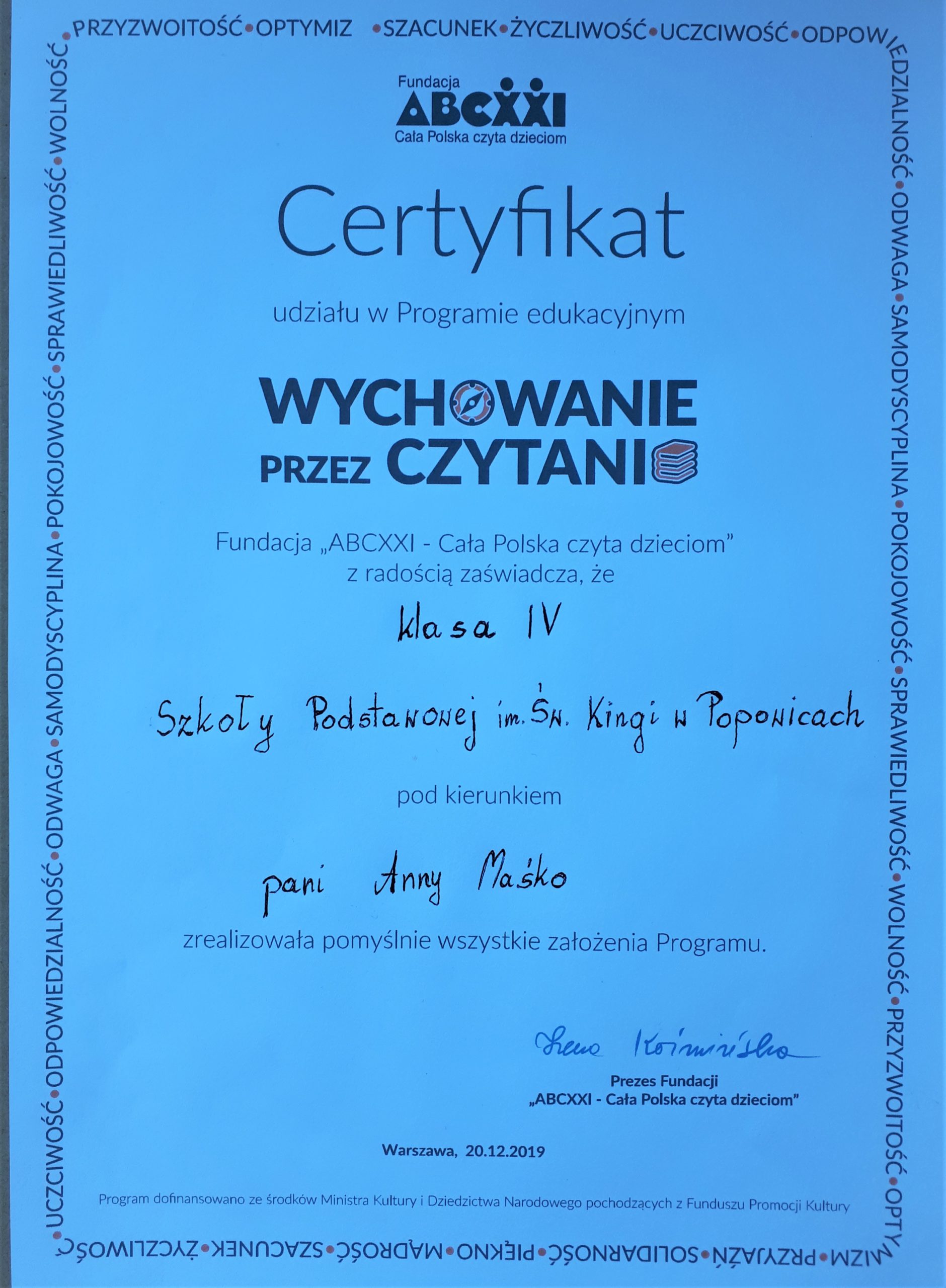 Miło nam poinformować, że klasa czwarta otrzymała certyfikat od Fundacji Cała Polska czyta dzieciom za udział w programie edukacyjnym “Wychowanie przez czytanie”.
