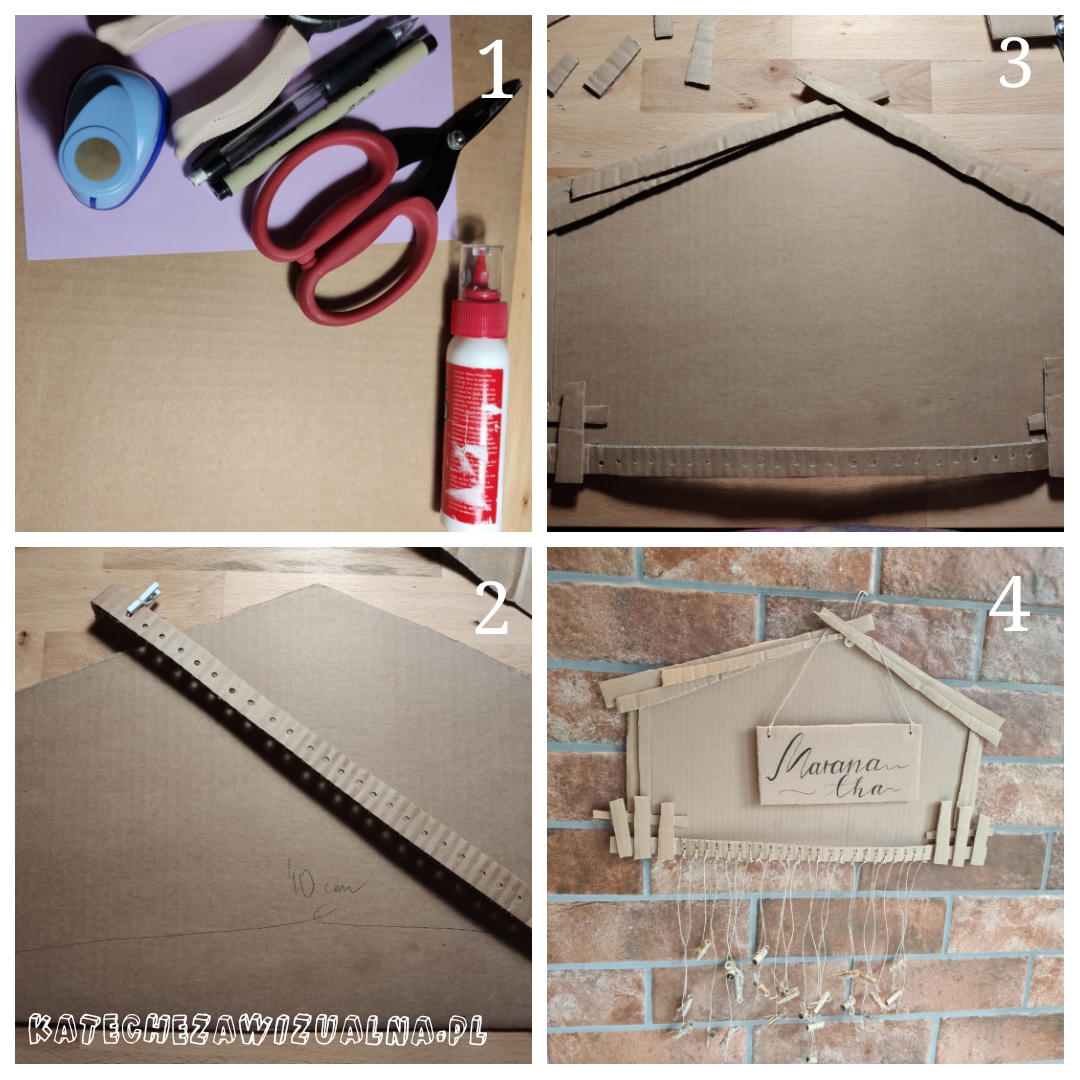 4. z resztek tworzymy płotek, dachówki – żeby nasz projekt nabrał przestrzenności, tabliczkę Marana Tha (Przyjdź Panie Jezu)