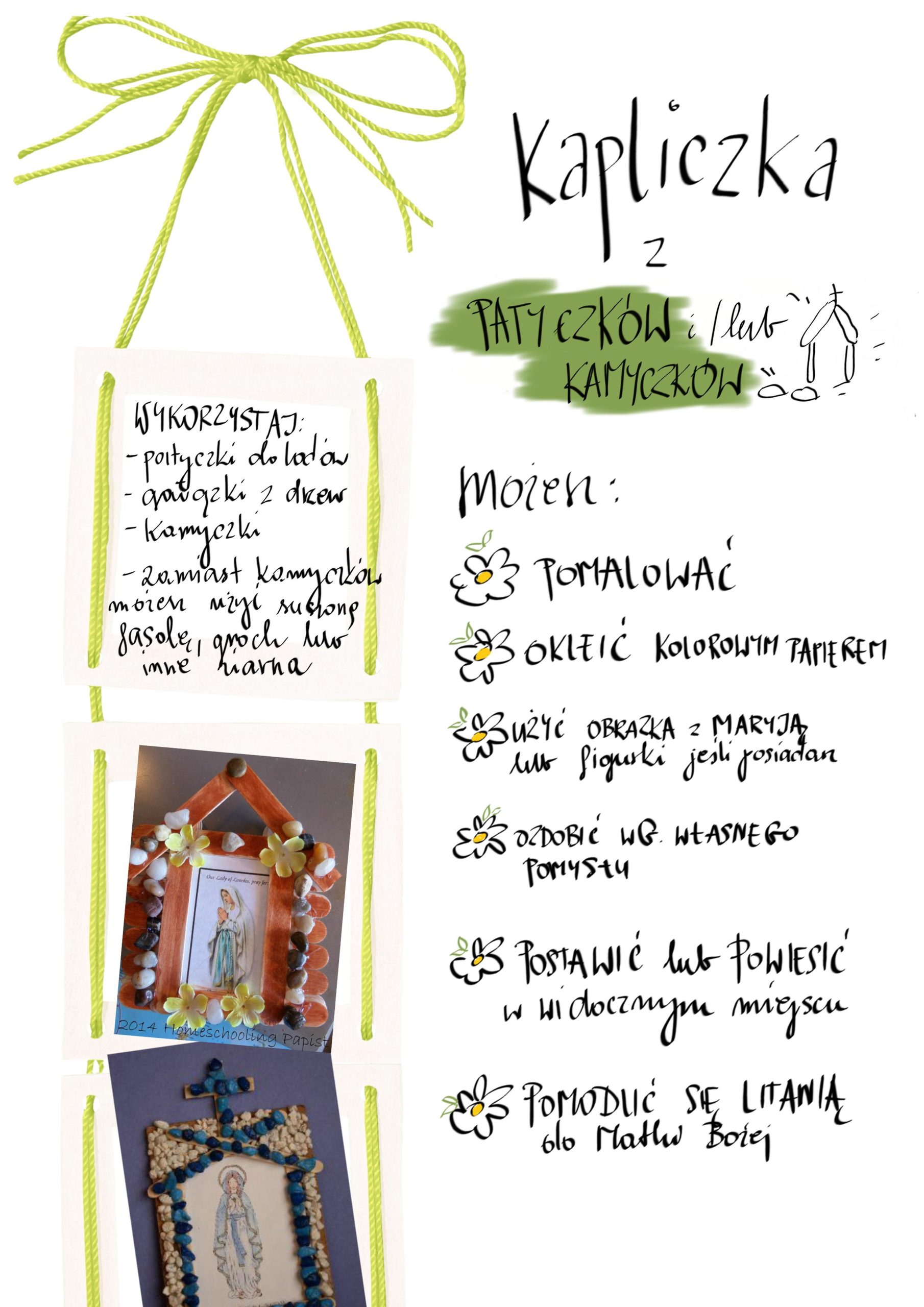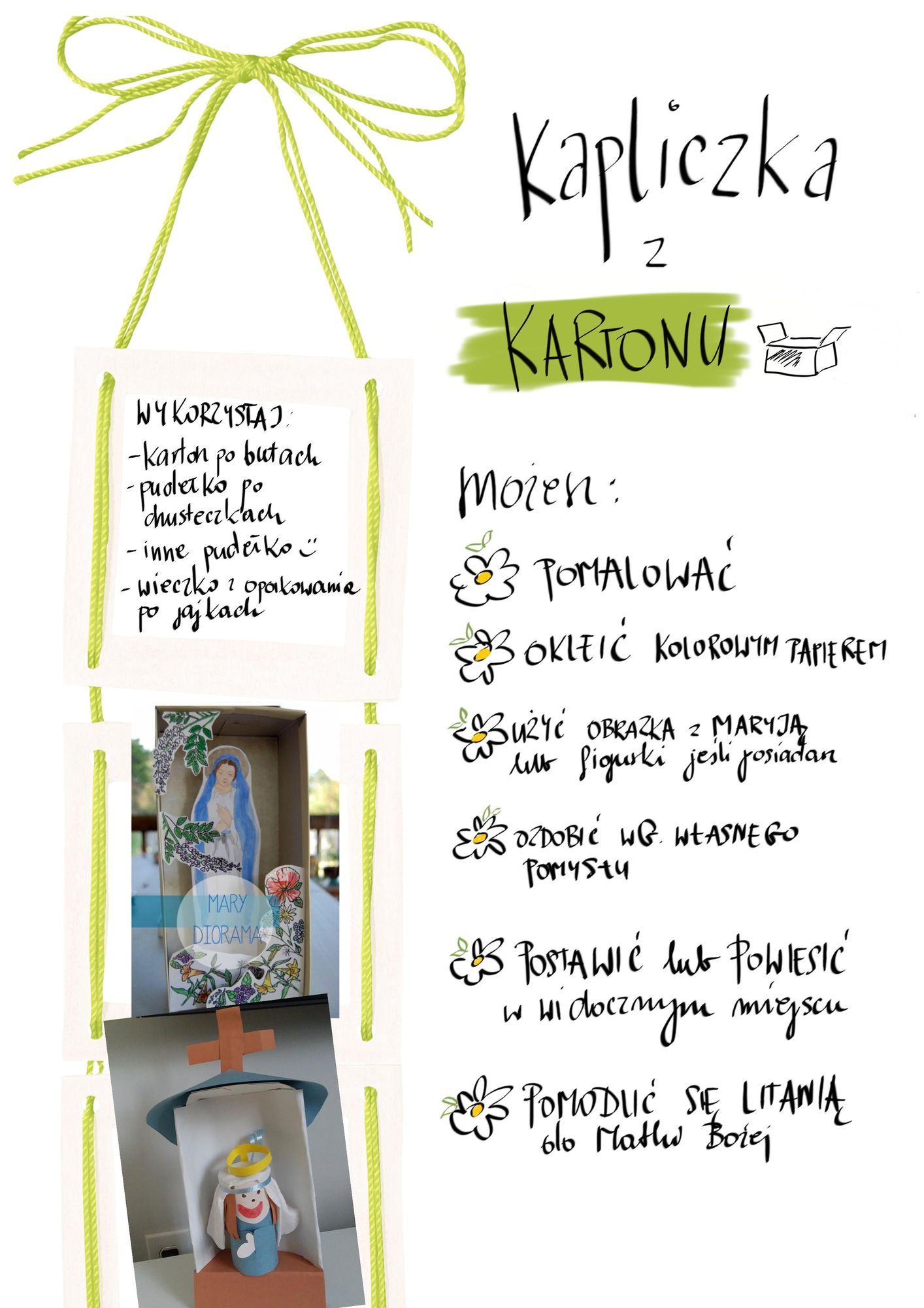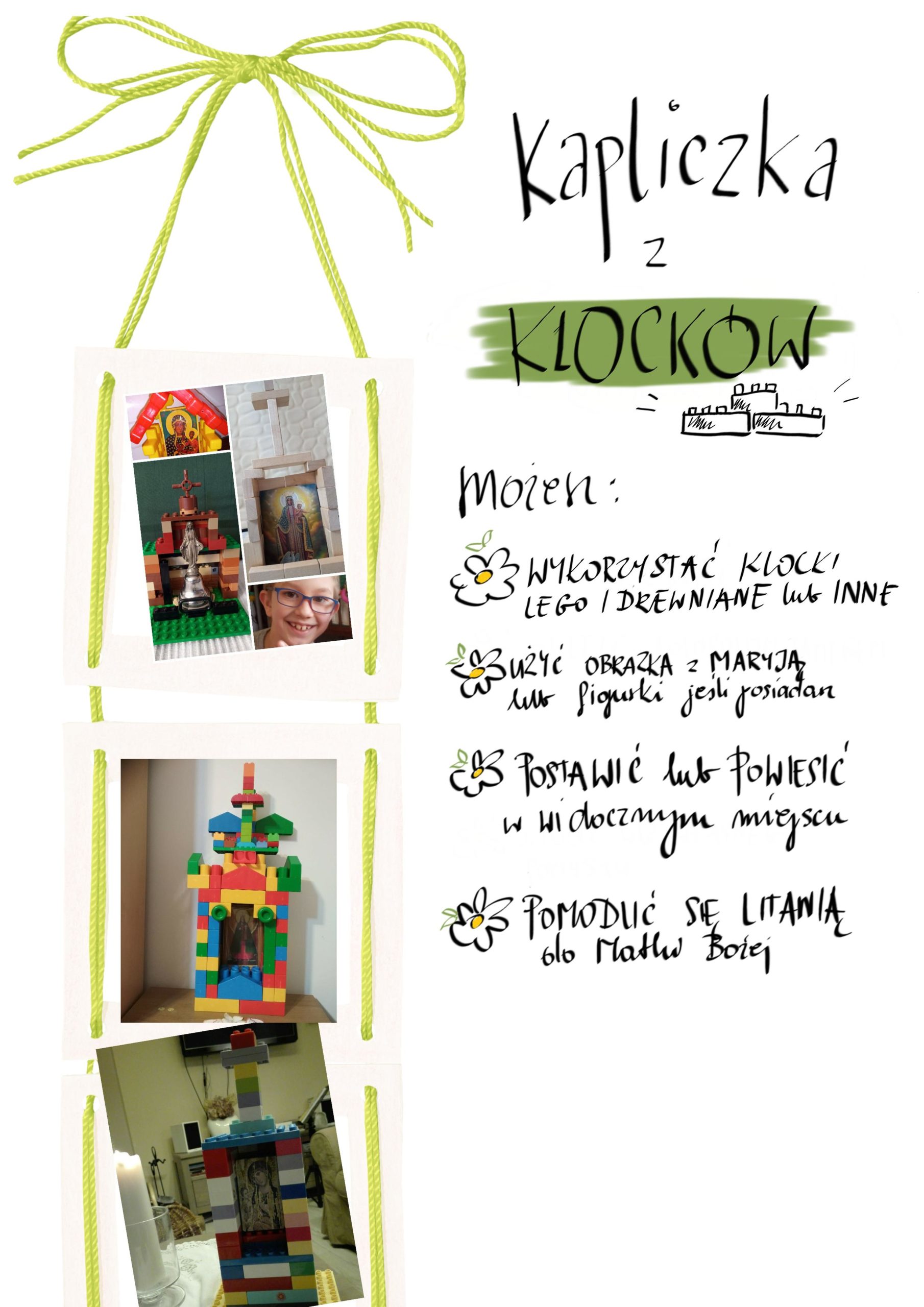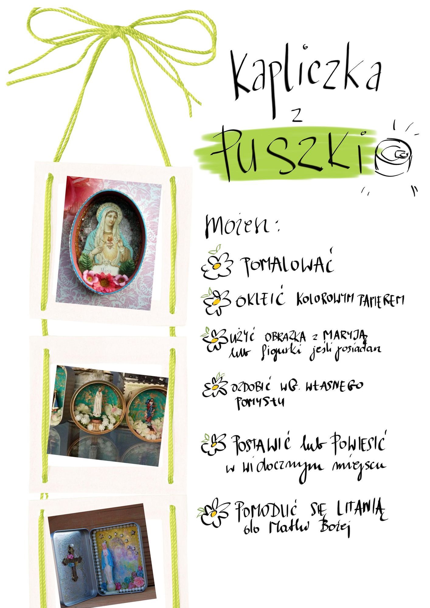 Zapraszam wszystkich do udziału w nabożeństwach majowych w kaplicy w Popowicach codziennie o 16:30, a w niedzielę po Mszy świętej o 9:00 oraz w przydomowych kapliczkach. Można także nabożeństwo majowe odprawić w domu. Warto więc zrobić domową kapliczkę MB i na tym będzie polegał konkurs, aby ją wykonać według wskazówek umieszczonych poniżej. Można ją zrobić z pudełka, puszki, patyczków i kamyków lub klocków. Zdjęcia wykonanych prac trzeba przesłać ks. Tomkowi na teamsie lub mailem starzectomek@gmail.com do poniedziałku 24 maja br. Dla wszystkich uczestników przewidziane nagrody: słodycze i oceny celujące, a wśród uczestników wylosujemy… jeszcze nie wiem co! Jak macie jakieś propozycje proszę pisać.