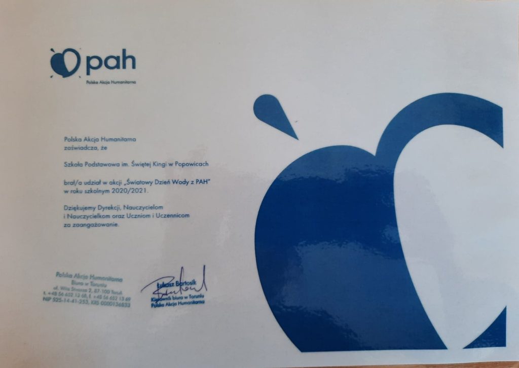 Szkoła otrzymała dyplom za udział w akcji „Światowy Dzień Wody z PAH”. Celem było zaangażowanie największej liczby osób i szerzenie świadomości o tym, że: