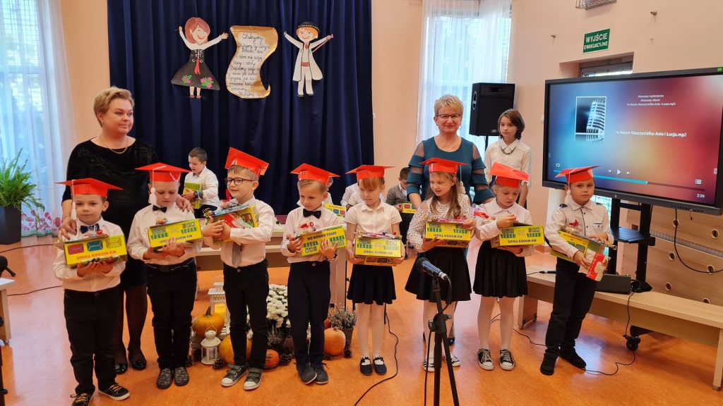 Dziś w czwartek 28 października br. odbyła się wilka uroczystość w naszej szkole: dzieci z klasy pierwszej zostały pasowane na ucznia. Całą uroczystość przygotowała wychowawczyni klasy pierwszej, Pani Aneta Lompart, którą wsparły Pani Agata Nicpońska, Pani Marta Słaby, Pani Marta Kowalczyk i dzieci z zerówki oraz z klasy drugiej, trzeciej, czwartej, szóstej i ósmej. Prawie całą szkołą wzięła udział w przygotowaniu tego wydarzenia. Rozpoczęło się ono częścią artystyczną, w której wystąpiły dzieci z klasy pierwszej i drugiej, a swoim śpiewem ubogaciła tę część Lena Drożdż oraz Weronika Górska wraz z Martyną Lompart i Ania Nikołajczuk wraz z Łucją Wróblewską. Następnie wprowadzono sztandar szkoły i uroczyście odśpiewano hymn państwowy i naszej szkoły. Potem uczniowie złożyli ślubowanie i wtedy… Pani Dyrektor Grażyna Smaga pasował dzieci na uczniów. Następnie dzieci złożyły podpis – odcisk palca pod ślubowaniem. Potem były już tylko prezenty i życzenia. Po przemówieniu Pani Dyrektor wystąpiła Przewodnicząca Samorządu Uczniowskiego Weronika Górka, która złożyła dzieciom życzenia oraz przekazała dzieciom skarbonki, dzięki którym nauczą się mądrze wydawać pieniądze, dużo oszczędzać i dzielić się z potrzebującymi. Skarbonki otrzymały dzieci z klasy pierwszej i drugiej, ponieważ biorą udział w kursie edukacji finansowej CROWN. Następnie prezenty przekazała od Rady Rodziców Pani Agnieszka Tokarczyk. Potem były prezenty od zerówki, od klasy drugiej i trzeciej. Na samym końcu był poczęstunek: kawa, herbata, ciastka. I tutaj należą się rodzicom klasy pierwszej szczególne podziękowania, za ich obecność, wspieranie swoich dzieci, współpracę ze szkołą i życzliwość dla naszej szkoły. TUTAJ są zdjęcia, a poniżej piosenki.