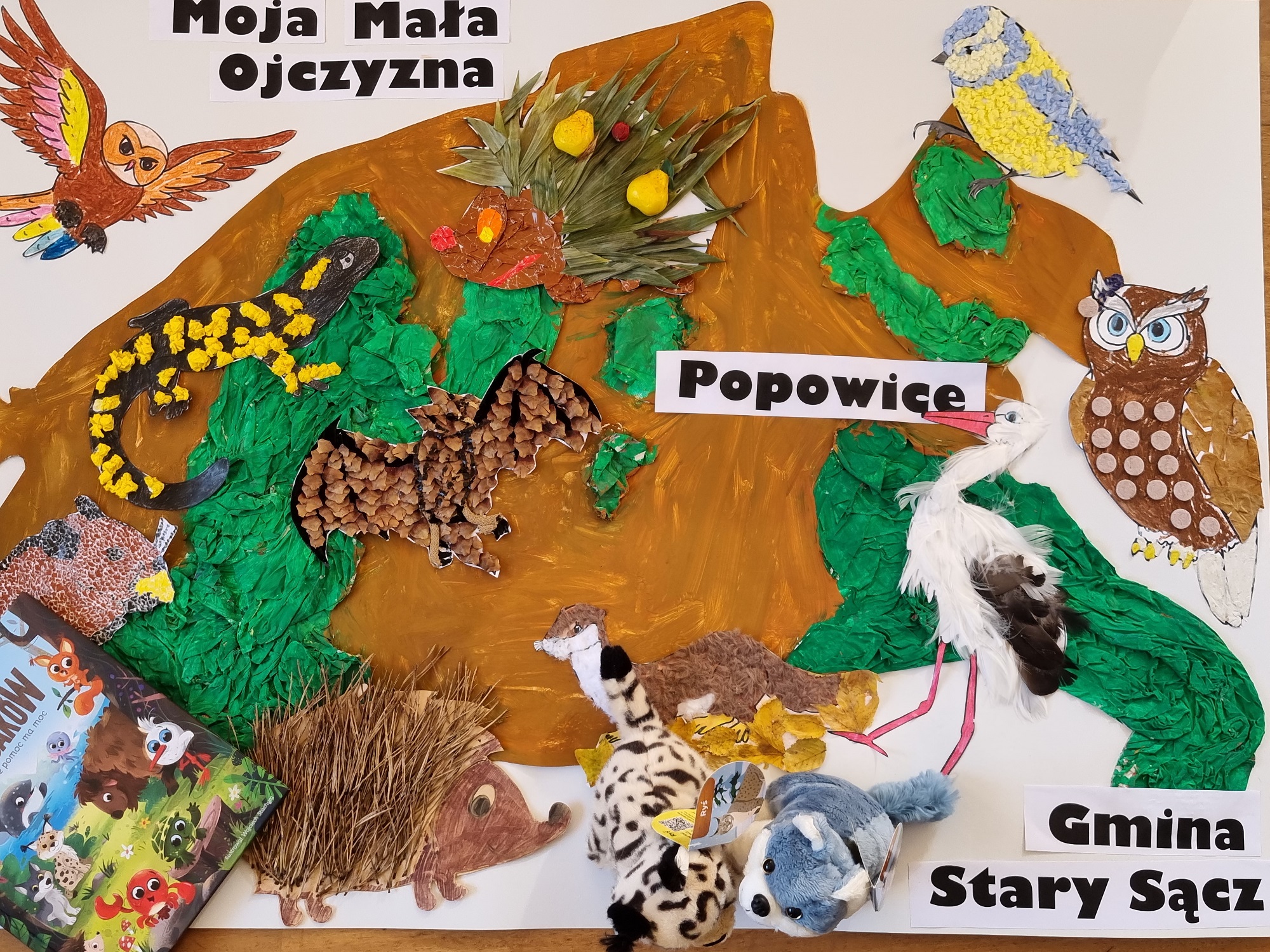Naszym zadaniem było przygotowanie pracy zbiorowej w formie MAPY MAŁEJ OJCZYZNY, którą jest Gmina Stary Sącz, na której zaprezentowaliśmy zagrożone i chronione gatunki zwierząt na naszym terenie. A oto jej zdjęcie: