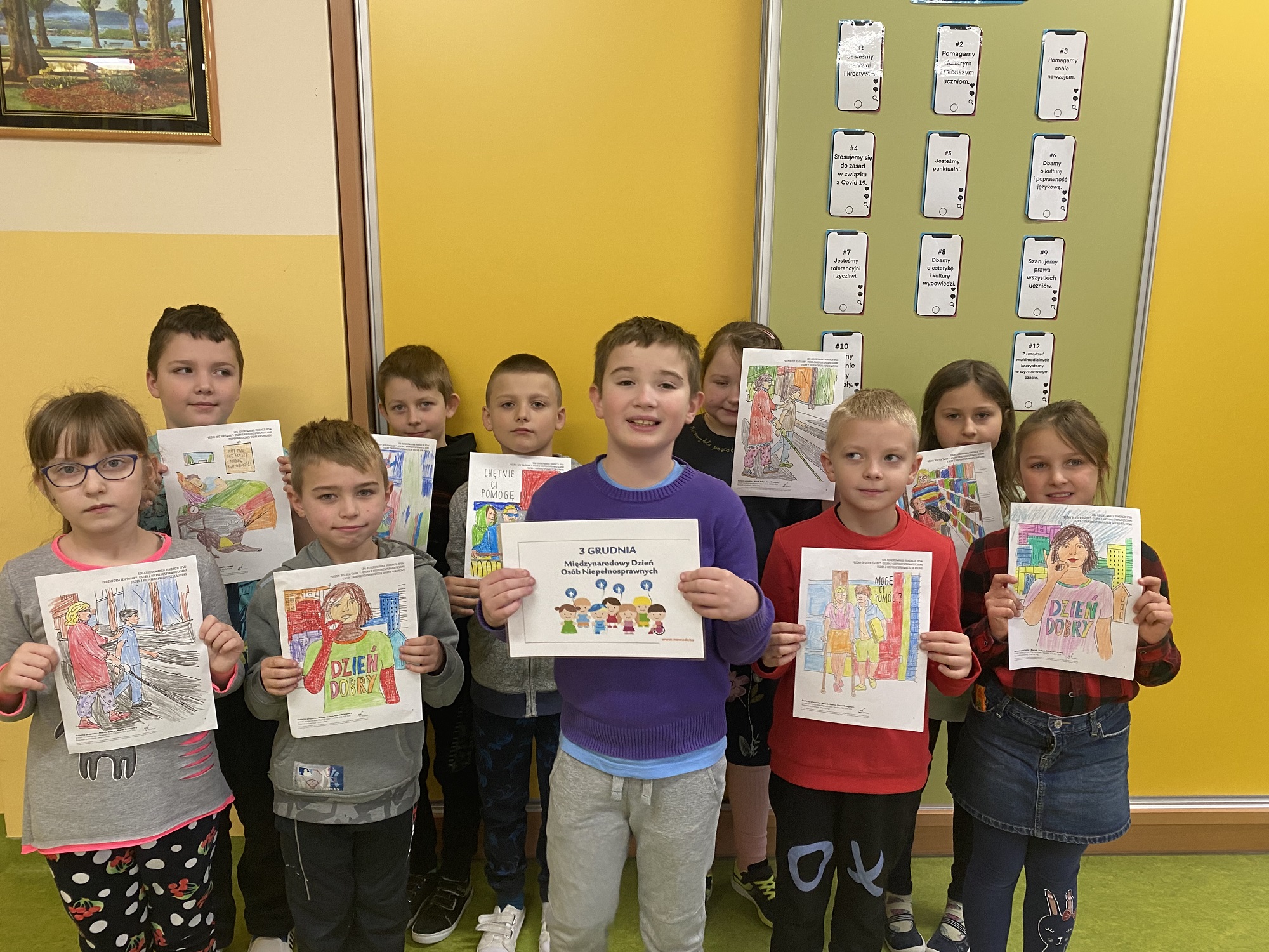 Co roku 3 grudnia obchodzimy Międzynarodowy Dzień Osób z Niepełnosprawnościami, którego celem jest zwiększenie świadomości publicznej na temat ograniczeń, z jakimi borykają się osoby z niepełnosprawnościami i potrzeby konkretnych działań w kierunku ich likwidowania. Z tej okazji w dniu dzisiejszym dzieci z klasy 2 poznały różne rodzaje niepełnosprawności i tym samym zrozumiały jak ważna jest tolerancja i empatia. Na zakończenie zajęć uczniowie wykonali kolorowanki przedstawiające sytuację w których każdy z nas może pomóc drugiemu człowiekowi.