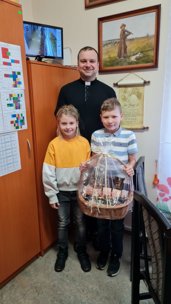 Bardzo chciałem podziękować wszystkim uczniom i rodzicom, których przedstawiciele z Rady Rodziców złożyli mi z zaskoczenia życzenia imieninowe i przekazali pełny kosz prezentów. Bóg zapłać.