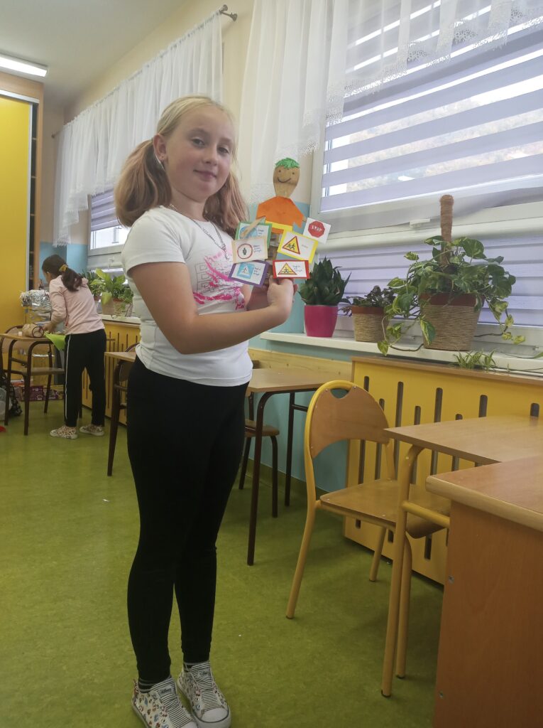 W szkole promuje się bezpieczeństwo w ruchu drogowym. W związku z tym na lekcjach techniki uczniowie klasy IV wykonali pacynkę: Pan STOP. Potrzebowali do tego drewnianej łyżki, kolorowego papieru, klamerek do bielizny oraz zapału do pracy i znajomości znaków drogowych. Pan STOP trzyma wybrane przez uczniów znaki drogowe. W ten sposób doskonalili swoją wiedzę ze znajomości znaków drogowych, zapamiętując ich kształty i kolory. Wszyscy uczniowie zaangażowali się w wykonanie pacynki.