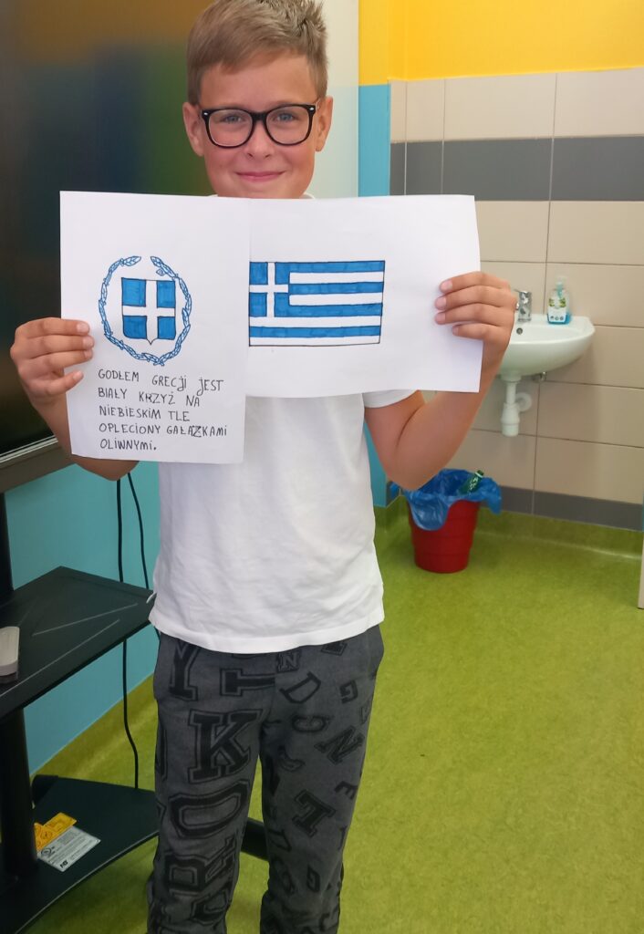 wykonaliśmy symbole narodowe, stworzyliśmy słownik obrazkowy, poznaliśmy znane postacie i ciekawe miejsca z tego Państwa. Ponadto poznaliśmy rośliny i zwierzęta występujące w tym kraju, stolice-Ateny oraz kuchnie śródziemnomorska. Nauczyliśmy się przedstawiać po grecku. Wykonaliśmy pocztówkę przedstawiająca to Państwo.