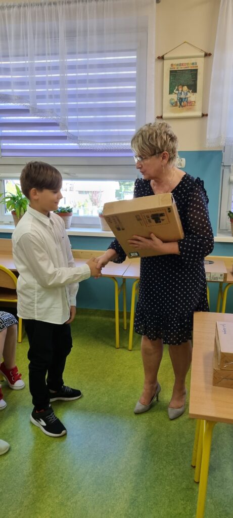 Uczniowie z klasy IV otrzymali dziś z rąk pani Dyrektor Grażyny Smaga swoje laptopy w związku z uruchomieniem rządowego programu wsparcia rozwoju kompetencji cyfrowych ucznia klasy IV.