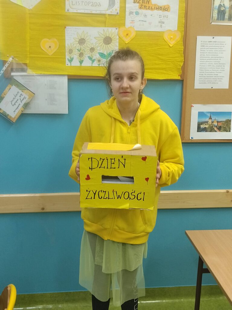„Bądź dla wszystkich życzliwy, a świat będzie szczęśliwy” – to hasło towarzyszyło nam 21 listopada, kiedy w naszej szkole odbywał się Światowy Dzień Życzliwości i Pozdrowień. Cała społeczność szkolna swoją radość, entuzjazm postanowiła wyrazić poprzez żółte akcenty w ubiorze. Na korytarzu pojawiła się „Skrzynka Życzliwości i Pozdrowień” na życzliwe liściki, pozdrowienia, laurki, które później wzajemnie sobie przekazywano . W klasach również nie brakowało „życzliwych” pomysłów – rozmawialiśmy o tym, że bycie życzliwym jest ważne,