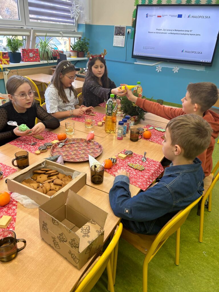 Czas oczekiwania na święta Bożego Narodzenia należy do najpiękniejszych w roku. W całej szkole czuć magię zbliżających się świąt. Tak też dzisiaj było w klasie 5 – magicznie i świątecznie. Wszyscy przy wspólnym stole , słuchając pięknych kolęd dekorowaliśmy pierniczki. Udało nam się osiągnąć to co w świętach Bożego Narodzenie jest najważniejsze : spokój, uśmiech, życzliwość o których na co dzień zdarza nam się zapominać. Dziękujemy Pani Dyrektor za udział w naszym spotkaniu, a rodzicom za pomoc w organizacji.
