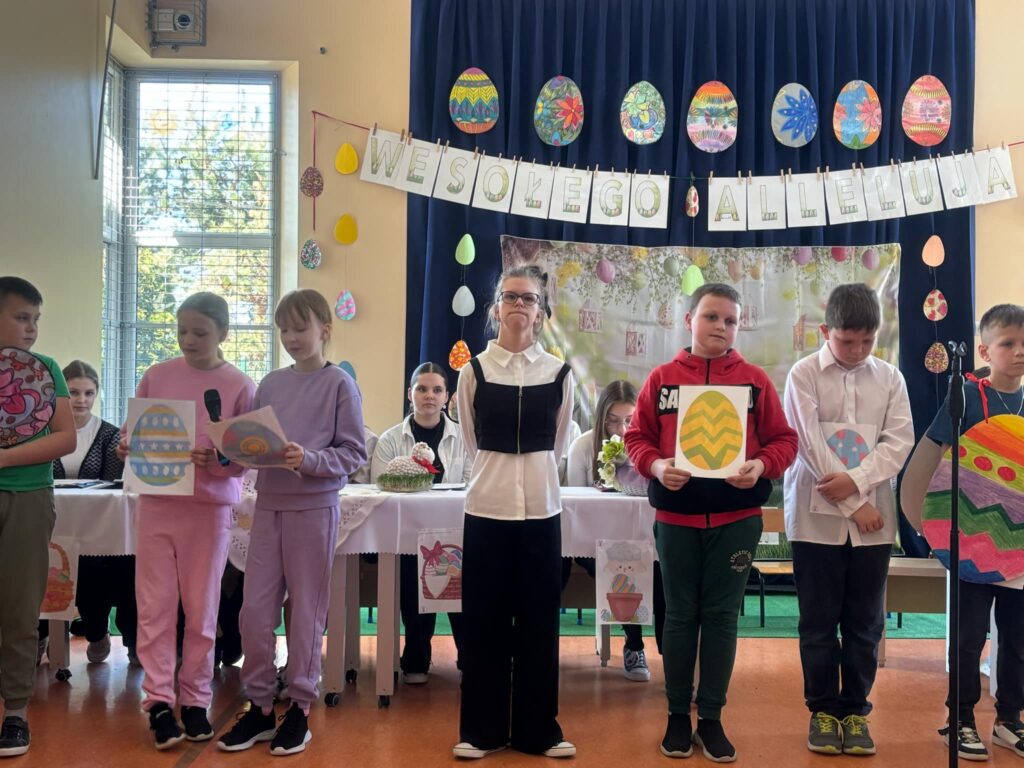 Jak co roku w naszej szkole odbył się “Poranek Wielkanocny”. Na sali gimnastycznej spotkali się wszyscy uczniowie wraz z nauczycielami i Panią dyrektor Grażyną Smagą aby wspólnie przypomnieć sobie najważniejsze tradycje związane ze Świętami Wielkanocnymi. Program artystyczny przygotowali uczniowie klasy 7 pod przewodnictwem pań: Agaty Nicpońskiej i Marii Tokarczyk . Piosenki wielkanocne wykonali uczniowie klasy 4 i nasza niezawodna uczennica klasy 8-Andżelika Szczęsna. Na koniec spotkania nie zabrakło wspólnych życzeń a także symbolicznego polewania wodą.