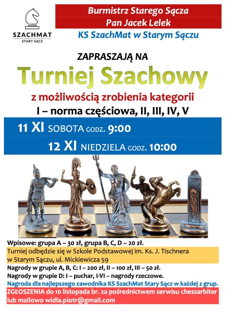 PLAKAT Grupa A (min. 1800 pzszach, norma częściowa) http://chessarbiter.com/turnieje/2023/ti_6819/ Grupa B (min. 1600 pzszach) http://chessarbiter.com/turnieje/open.php?turn=2023/ti_6820&n= Grupa C (min 1250 pzszach) http://chessarbiter.com/turnieje/open.php?turn=2023/ti_6821&n= GRUPA D (OPEN, możliwość wypełnienia V i IV kategorii) Turniej jednodniowy! 11.11.2023 http://chessarbiter.com/turnieje/2023/ti_6985/